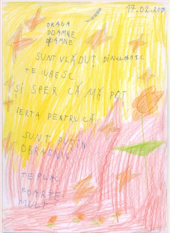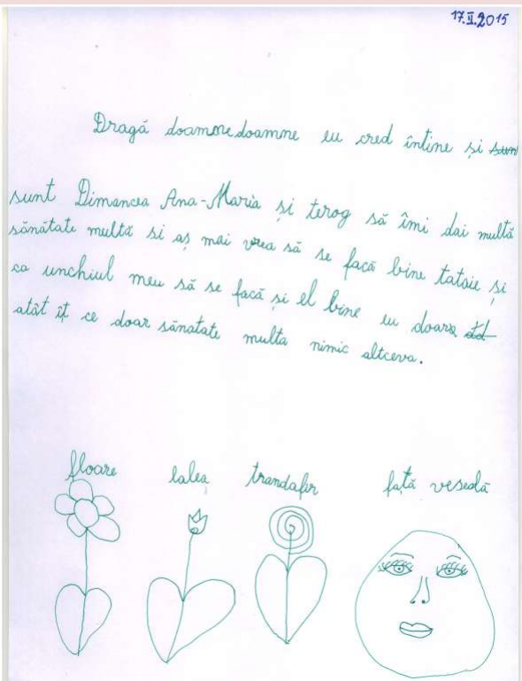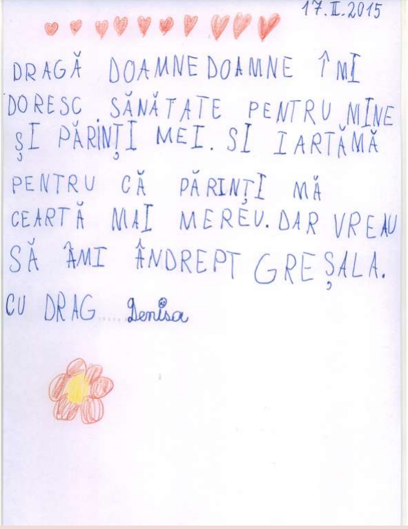 Nu pot să numesc altfel experienţa deosebită pe care am trăit-o în urma unei ore de religie la clasa I. Vorbisem despre iubirea lui Dumnezeu faţă de om, despre iubirea noastră faţa de cei dragi. I-am rugat pe elevi să scrie o scrisoare adresată lui Dumnezeu. M-au emoţionat profund rândurile lor. Iată câteva dintre acestea!