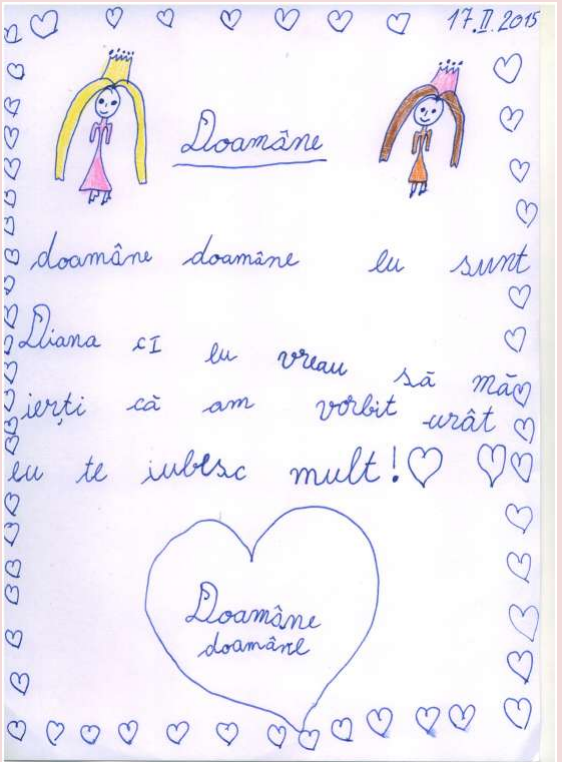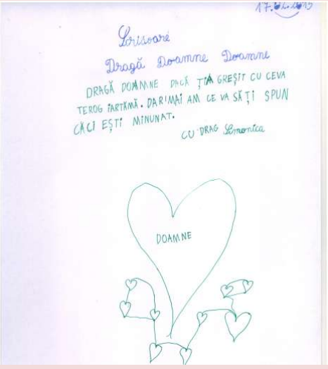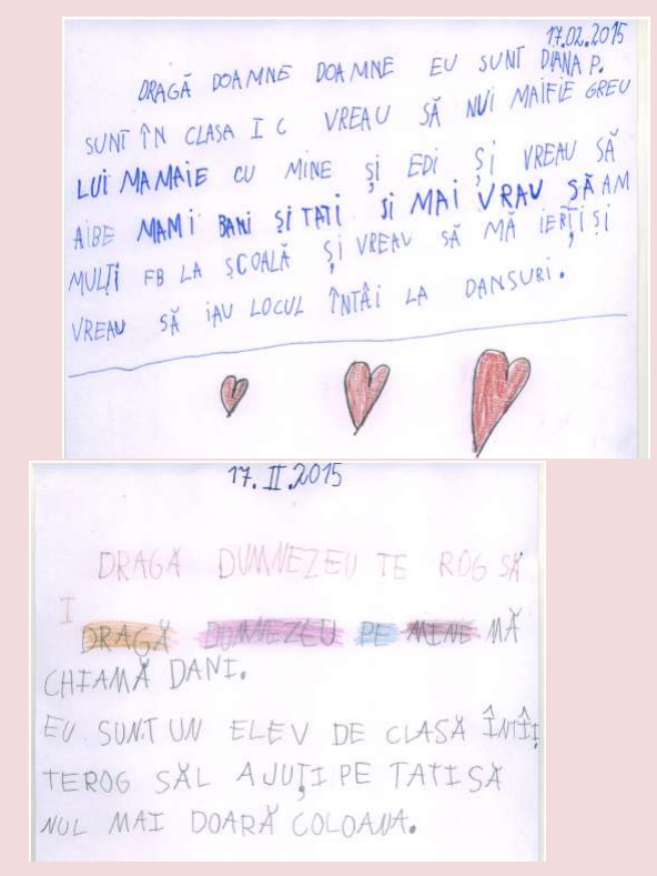 Nu pot să numesc altfel experienţa deosebită pe care am trăit-o în urma unei ore de religie la clasa I. Vorbisem despre iubirea lui Dumnezeu faţă de om, despre iubirea noastră faţa de cei dragi. I-am rugat pe elevi să scrie o scrisoare adresată lui Dumnezeu. M-au emoţionat profund rândurile lor. Iată câteva dintre acestea!