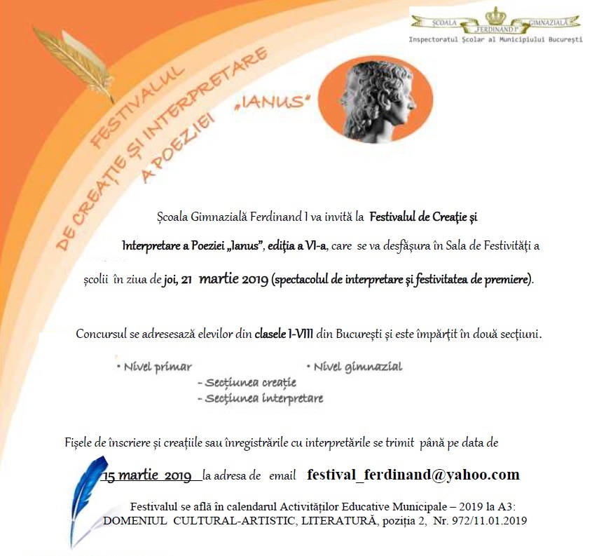 Dragi elevi, părinți, bunici, parteneri ai școlii, dragă comunitate, cadrele didactice și elevii Școlii Gimnaziale "Ferdinand I" organizează Festivalul Toamnei, după cum bine ne-am obișnuit să ne întâlnim în fiecare toamnă, pentru a simți bucuria acestui anotimp încărcat de armonii și culoare.