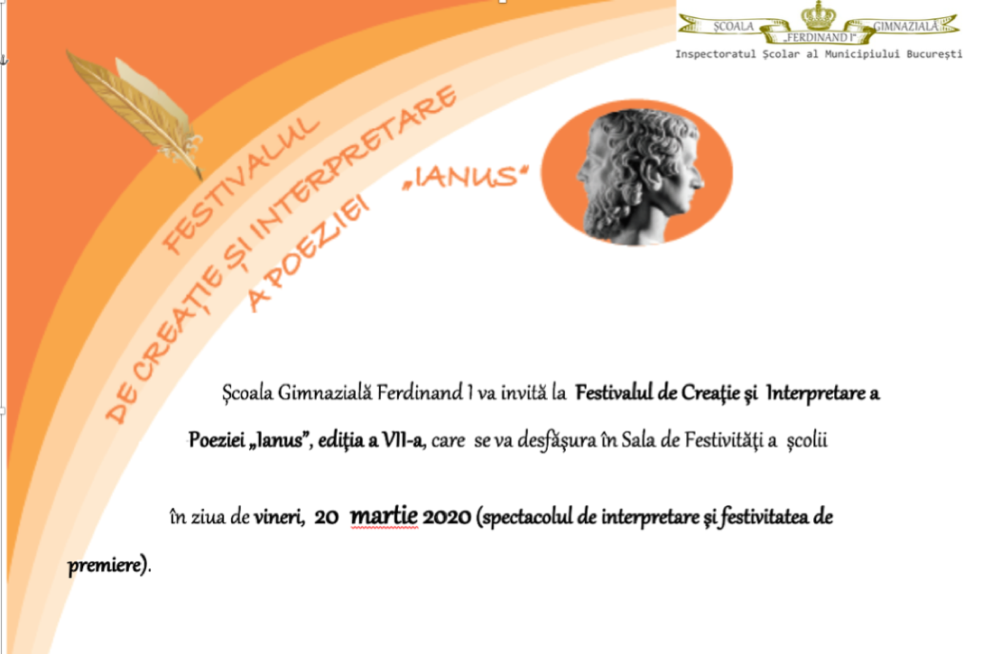 Școala noastră are bucuria de a vă invita la cea de-a VII-a ediție a Festivalului de creație și interpretare a poeziei IANUS care se va desfăşura în Sala de Festivităţi a școlii, vineri, 20 martie 2020 (spectacolul de interpretare şi festivitatea de premiere).
