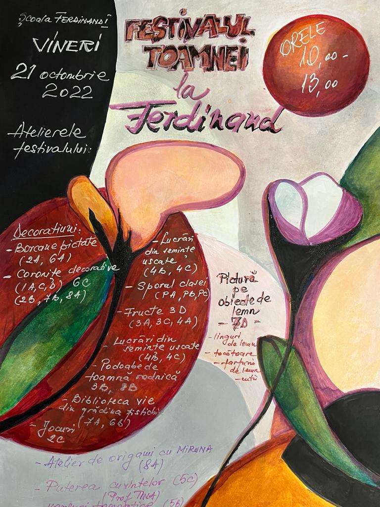 Pentru a experimenta profunda emoție a acestui sezon, Școala Gimnazială „Ferdinand I„ vă invită la Festivalului Toamnei, sărbătoare devenită tradiție datorită comunității noastre. În plimbările lor, copiii adună mici comori pe care le regăsim apoi în buzunare. Toamna, anotimpul propice pentru creații artistice și descoperiri este un moment perfect pentru mici colecții de castane, nuci, pietre, ghinde și frunze. Adunăm idei mari și mici, dăm frâu liber creativității și țesem povestea toamnei ÎMPREUNĂ în cadrul atelierelor ce vor avea loc vineri, 21 octombrie 2022, începând cu ora 10:00, în curtea interioară a Școlii Gimnaziale Nr. 25.
